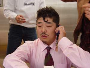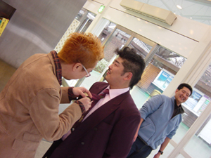 続いてヘアスタイルに変化を。電話の内容は大事な用件らしく、おとなしい