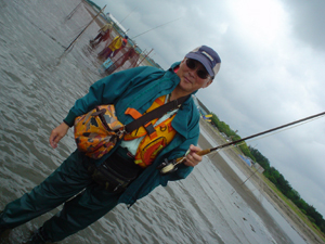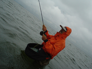 ![]() ケニーたぐり。ロッドを肩に乗せてティップは水中の両手たぐり。 ストライクの瞬間、ロッドをもちかえるとき、走るラインでケガをしないようにしましょう。 |