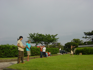 ![]() 午後になり、晴れ間も出はじめたところでエイゾーさんのレッスンがスタート!。初めてフライロッドを握るというヒラのベテラン、橋本ケイちゃん(中央)も短時間のレッスンできれいに振れるようになった。 |