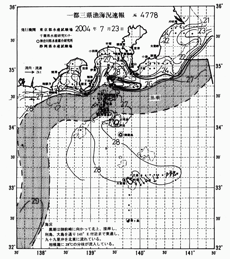 ![]() 剣崎沖の水温は26℃を超えている。ちょっぴりいやーな予感のまま船は西へと進む 当日の海況 |