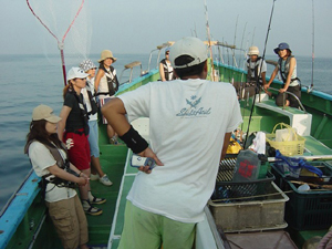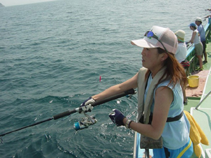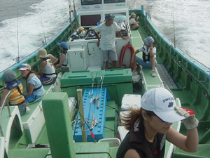 | ミミドル vol.3 主催:ミ−ミ−ズ/協力:村井丸(保田港) 7月24日、昨年と同じ保田港村井丸をお借りし、ミーミーズ・レディスドルフィンが開催された。 レディスアングラー限定のミミドルも、はやくも3回目となるが、カミナリ、シケと続けば次はいよいよ台風かと思いきや、なんとベタナギ! おまけに前日、前々日のメーターラッシュの翌日とあってボルテージも高まる。で、am6:00に保田港をメラメラと出航! ウーマンシイラ16lbの日本記録は10.6kg。このところの大型ラッシュに記録更新の期待もかかる! マイデジカメが洲崎沖で沈没してしまったので遠藤カメラマンの写真を拝借してお届けです。 (ソニーの防水デジカメU-60、浮きません。御愛用の同志たち、気を付けましょう) |