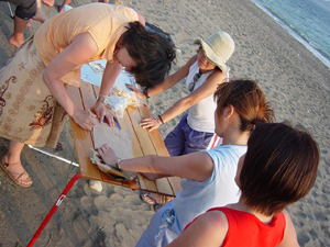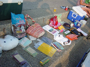 ![]() 下船後は近所のビーチでサウズエンドえんちゃんのご好意でバーベQ大会。写真は持ちよられた景品の数々 Tシャツ、植物、コメ、謎のくいもの、など |