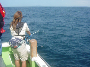 ![]() 金谷港の岡沢釣具店光進丸。スーパーミヨシはカジキを探すためのもの。ミヨシには電気モリ。プロ中のプロ。漁は遊びではないことを教えられる。その逆に釣りは遊びだということも教えられる。勉強になる船 |