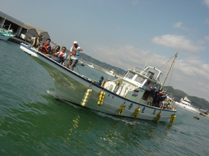 ![]() 保田港から村井丸。ミミドルでもおなじみの快適船。船頭トモさんのキャラもあって女性に人気。今回も女性を中心に乗っていただいた。 |