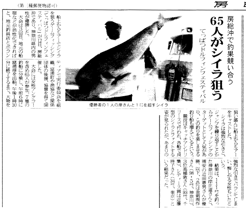 ![]() 今年から地元富浦町が後援。地元活性化の一助になればとの想いで、観光課を窓口に町長から優勝トロフィーも贈られた。 富浦はボディビル大会で有名な町だが、房総南端の地の利を生かした遊漁産業はまだまだ発展途上である。 漁業不振のなか、地元の期待もかかるのだ。 |