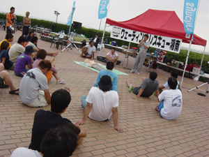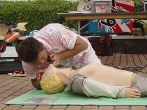 ![]() 救急救命士による救急救命術の講習。蘇生への努力は、まずは脳死の防止が目的と言ってもいいかも。 こういった事前体験を、多くの人に経験してもらいたい |