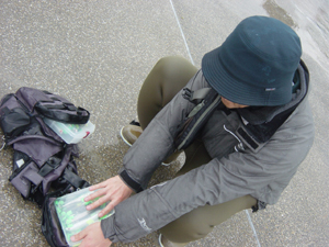 ![]() 真冬まんまの装備で臨むSBMスタッフの前田サン。 ルアーや小物類までもそのまんま。リアリティーなのだ |