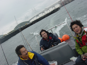 ![]() スキアシBチーム。てる(c)、ふさP、平田(Team Flat Field) 17尾をキャッチしたが入賞には及ばず。ボートは歌声シーバスボートCF25にしやん |