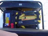 ![]() 荷台にバッテリー。 さらにエレキを積んだソリをつなげて引っ張る。 |
