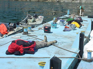 ![]() 恒例の浮き桟橋昼寝。徹夜明けなので、みんな爆睡。 |