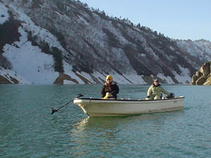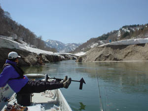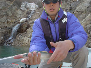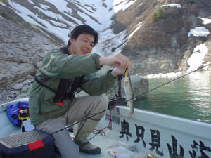 | つい先日、関東地方、Tシャツでも暑かった。しかしここ銀山では、朝は当然氷点下、ボートは凍る。 水位は満水まで15mほどと、特に問題なしだったが、残雪の量があまりに多い、そして水温が低い。 2日前は朝1度、当日は朝3度、昼でも4.5度と低水温。 ワカサギはまだ深い、フィッシュイーターも恐らく深い。 水温が上がらないと、表層ミノーイングでは厳しい状況だった。 しかし、来てみないとわからない、情報では今年は釣れてる!とのことだったが、ムーチングのエサ師はワカサギが捕れず「釣りにならねぇ」と嘆いていた。 あと2週間くらいがベストだろうか、ぜひチャレンジしてみたいものだ。 東京 山口 |