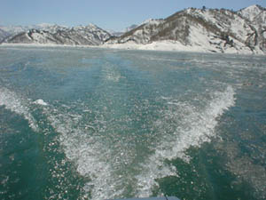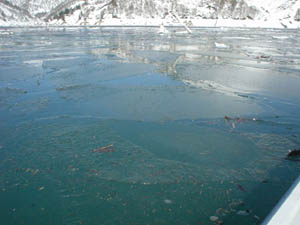 ![]() 風下には、氷は溜まる。 昼間の太陽はジリジリするほど、氷はどんどん解けて、ノープレッシャーエリアが広がる。「毎日が解禁日」だそうだ。 |