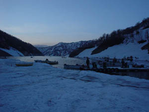 ![]() 早朝の桟橋、雪面の下は湖面に張った1m以上の氷。 |