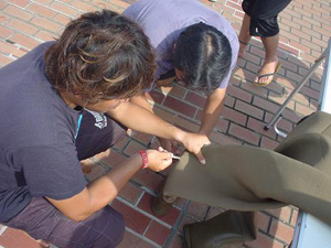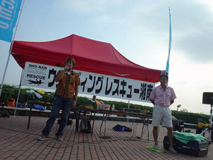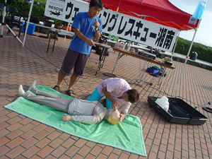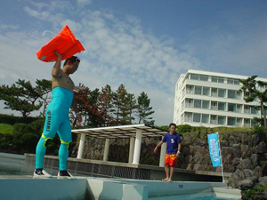 ![]() 陸に上がって一休みした後は緊急蘇生法の講習。講師は毎年お世話になっている佐竹さん。事故現場に直面した場合、1人で何とかしようとしないで、まずは助けを呼ぶ事。昨年聞いた事覚えてますか? |