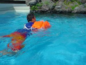 ![]() 腰用のインフレータブルのテスト。着用方法を知らせずに使用したところ取り付けが“後ろ前”に。U字型のフローターのようになるのが正解。既に持っている人は念のため確認を。 |