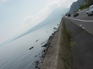 ![]() 隼人から鹿児島市内へ向かう国道。イルカが車と並走することもあるそうだ。 |